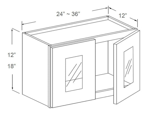 WALL CABINET GLASS INSERT DOOR - 2 DOORS, NO SHELVES, MATCHING COLOR INTERIOR - 30" WIDE X 12" DEEP X 18" HIGH