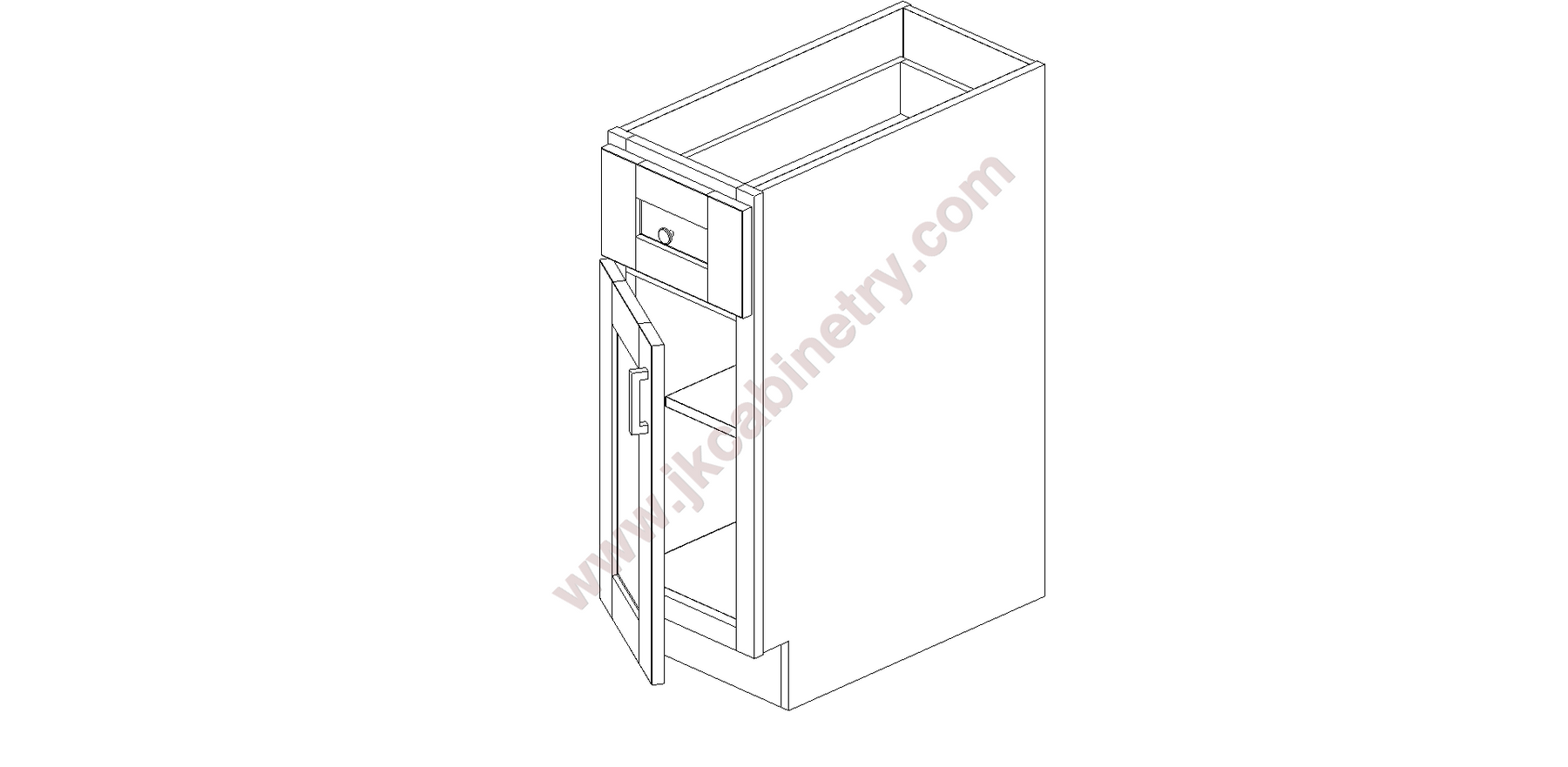 E1/B12 by J&K Cabinetry Login to view price or purchase. SKU E1/B12 BASE CABINET 1 DRAWER, 1 DOOR, 1 SHELF - 12" WIDE X 24" DEEP X 34.5" HIGH
