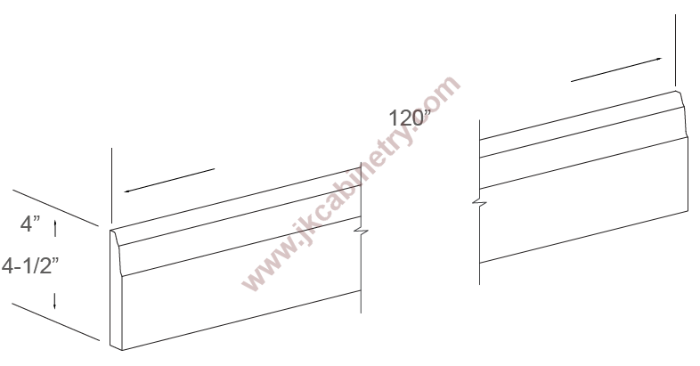 E1/BM10-4 1/2 by J&K Cabinetry Login to view price or purchase. SKU E1/BM10-4 1/2 BASE MOLDING - 120" WIDE X 4" HIGH