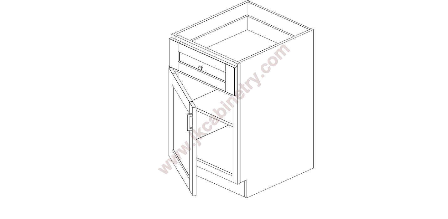 E2/B21 by J&K Cabinetry Login to view price or purchase. SKU E2/B21 BASE CABINET 1 DRAWER, 1 DOOR, 1 SHELF - 21" WIDE X 24" DEEP X 34.5" HIGH