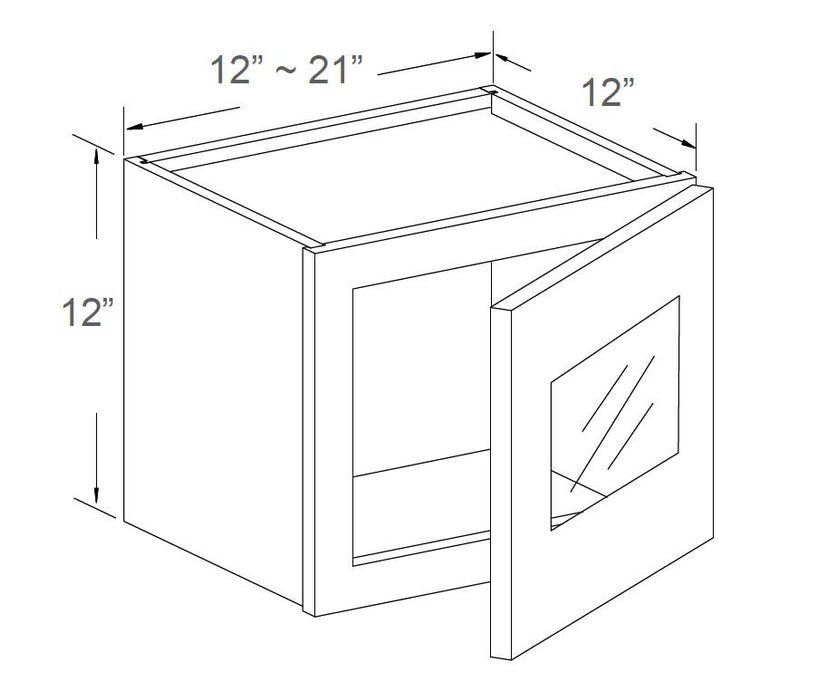 H3/WM1212H by J&K Cabinetry Login to view price or purchase. SKU H3/WM1212H WALL CABINET GLASS INSERT DOOR - 1 DOOR, NO SHELVES, MATCHING COLOR INTERIOR - 12" WIDE X 12" DEEP X 12" HIGH