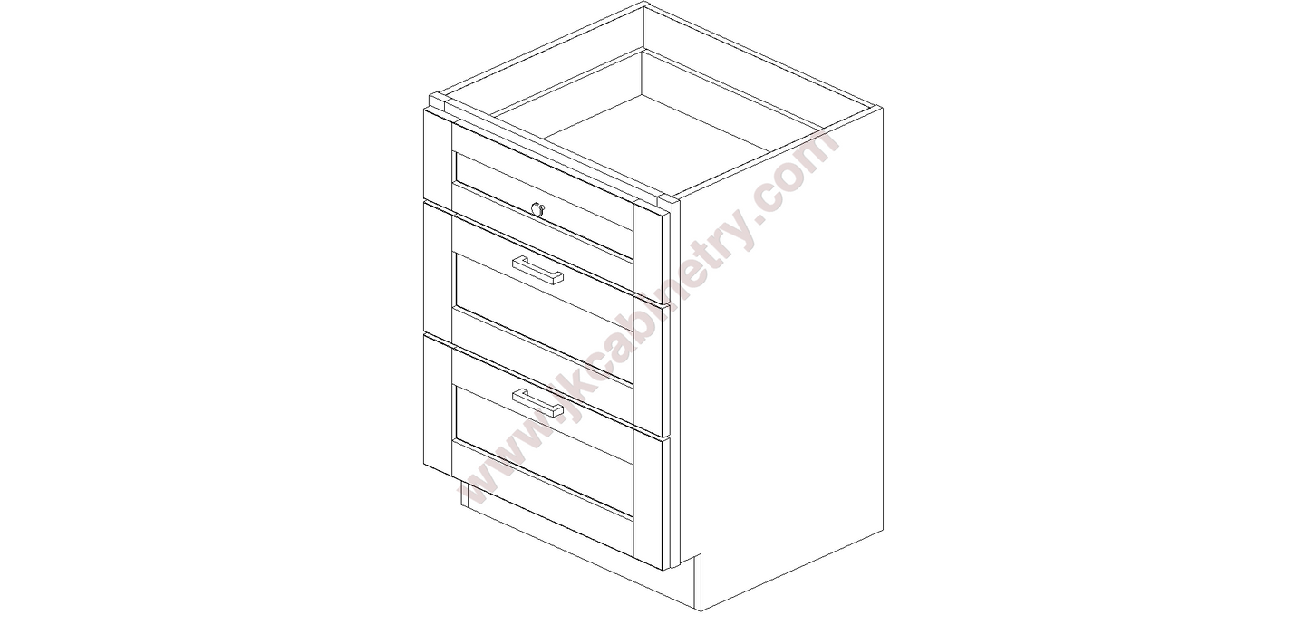 S8/SVA24D by J&K Cabinetry Login to view price or purchase. SKU S8/SVA24D VANITY DRAWER BASE - 3 DRAWERS - 24" WIDE X 21" DEEP X 33" HIGH